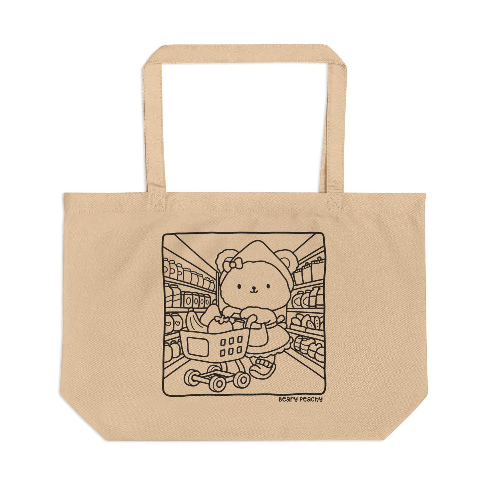 The Grocery Run Bear Tote is a roomy, eco-friendly bag designed to carry your daily essentials with ease and charm. Featuring a whimsical line-art illustration of a cozy bear pushing a shopping cart, it adds a playful, heartwarming touch to grocery runs, market trips, and everyday outings.