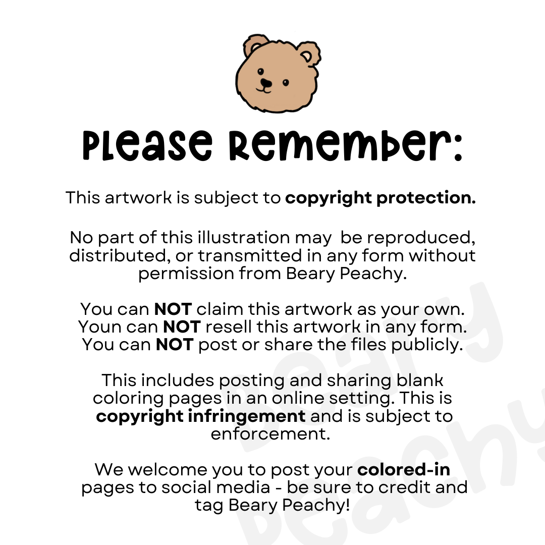You may NOT resell or repost the coloring pages. Be sure to credit and tag Beary Peachy if you post your coloring to any social media site.